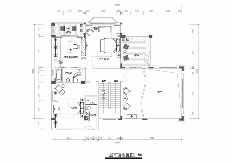 我是單家獨戶的住宅,占地250平方米,首層的設計已看過,效果不錯的。這是二層的平面圖,主要有一樓的中空大廳、主人房、小孩房和書房。幫我設計一下配什么燈好呢。